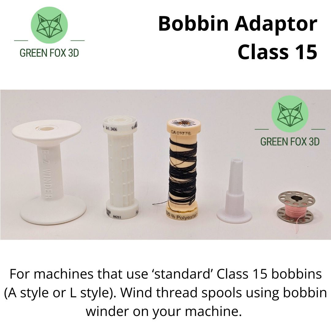 3D printed adapter to mount multiple 'standard' spool sizes onto a Class 15 bobbin winder.  Compatible with Mettler, Gutterman, EZ Winder and other similar spools.  Fits securely onto the bobbin winder.