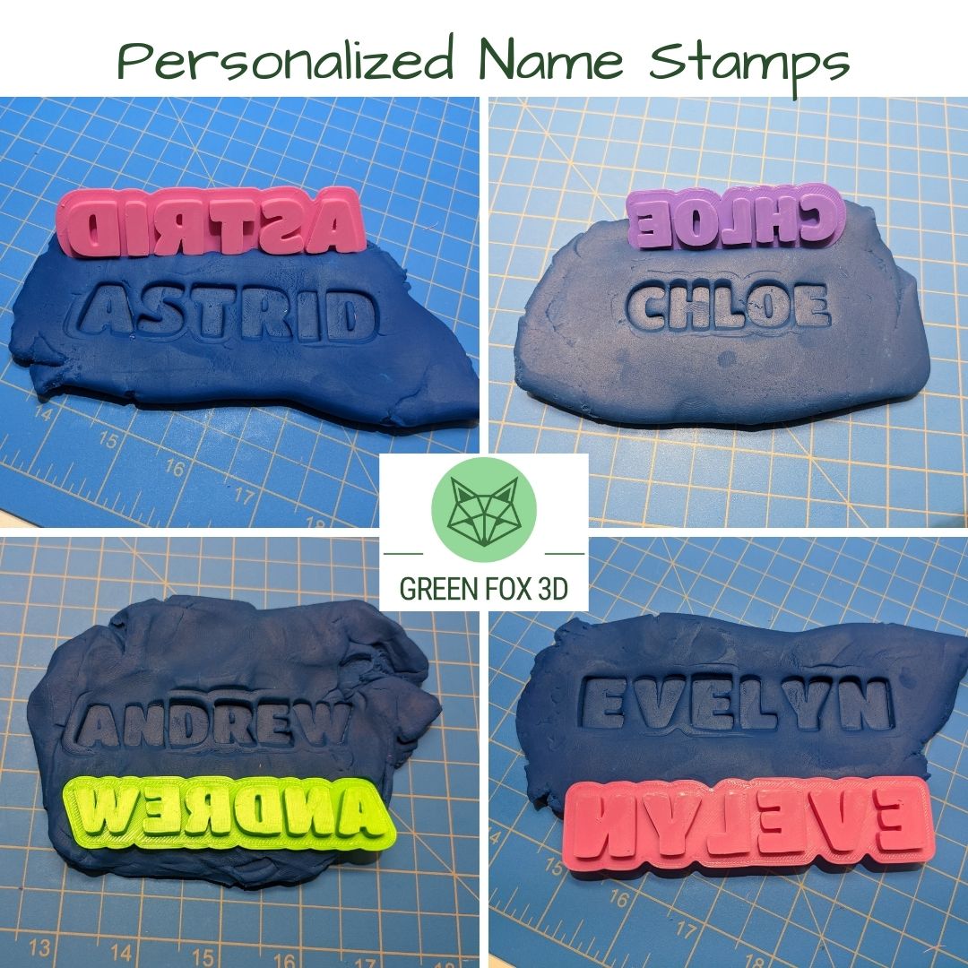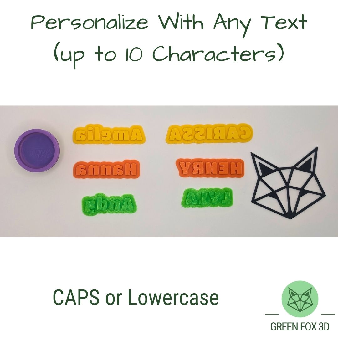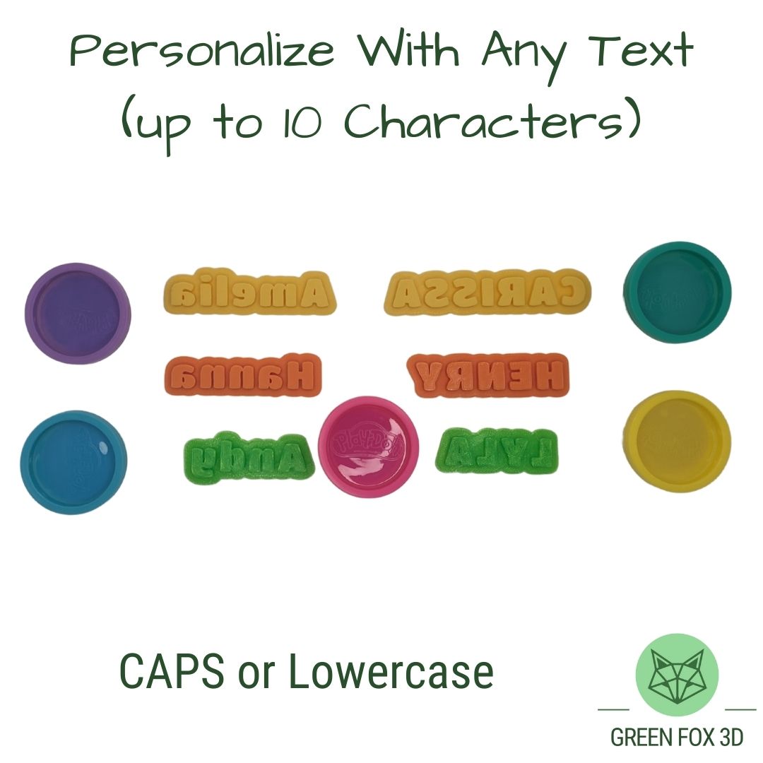 A perfect addition to your party! Every guest can have their own PERSONALIZED name stamp, perfect for use in play-doh, salt dough and kinetic sand. Use them at your party for a fun activity, and send each child home with a stamp and Play-Doh to keep!